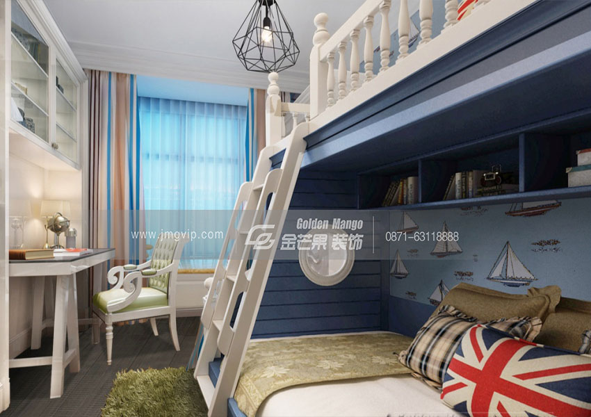 乳白色廊柱搭配上藍色是法式風格的一大體現,清晰、美妙。高低床更加實用,巴洛克風格的椅子,淺藍色的窗簾,融入寧靜的海洋。