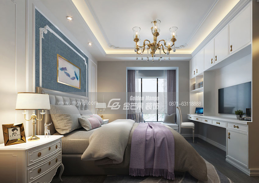 精美的吊燈和雕花,金黃色的燈光照射在乳白色的墻面上,更顯高貴。舒適飽滿的床,滿載沉沉的睡意。精美的儲物柜,讓房間更加干凈、整潔。