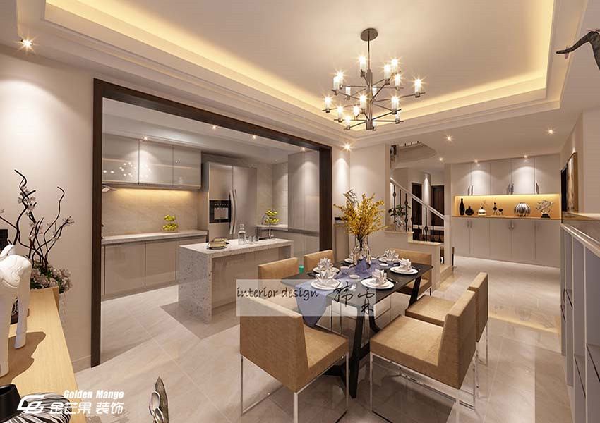 開放式的廚房、雙開門的冰箱、前衛(wèi)時尚的島臺成為高配的關(guān)鍵詞。銀色的柜體也顯得奢華無比,柜體下面的燈帶則是細心的體現(xiàn)。餐廳的設計則顯得簡約和舒適,更注重實用性。吊燈和燈帶搭配顯得獨一無二。