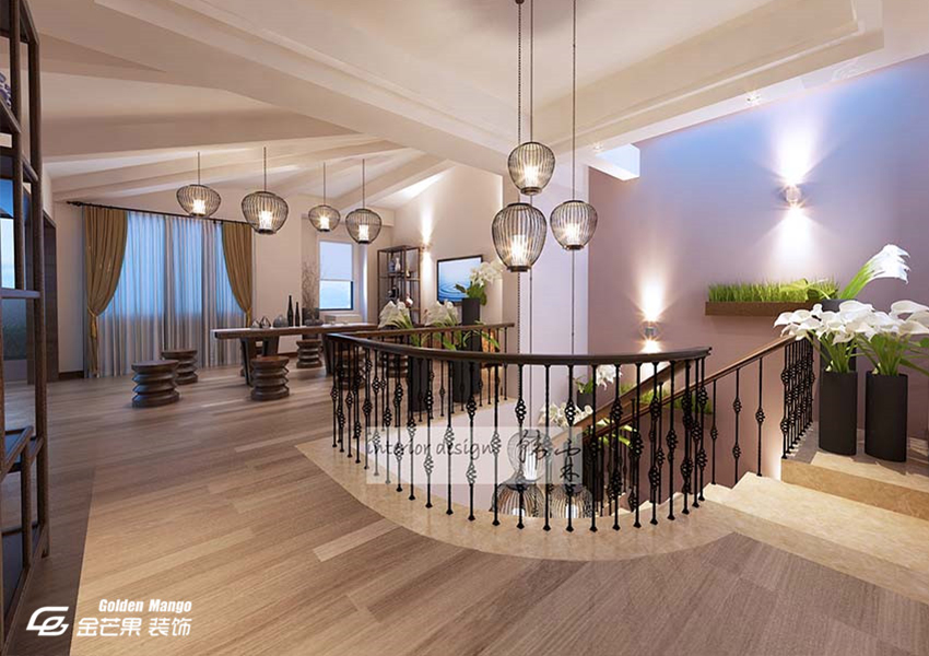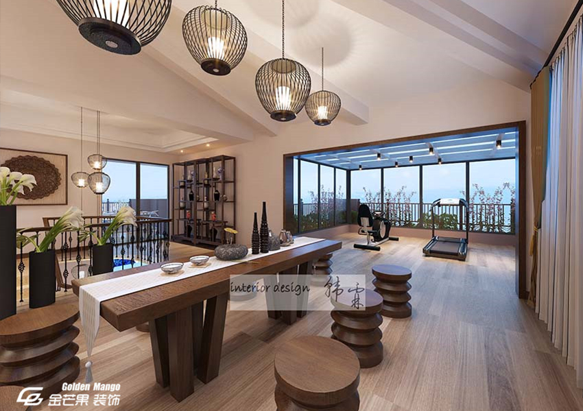 在二樓則是采用了大量的中式的元素,從品茶區(qū)的設計用心可以看出,主人對待客人的真誠,也是修身重道的體現(xiàn)。運動區(qū)則生命真正體現(xiàn)的地方,融入大自然,感受生命的氣息。一角陳列的陶瓷收藏品,也是歷史藝術(shù)的體現(xiàn)。