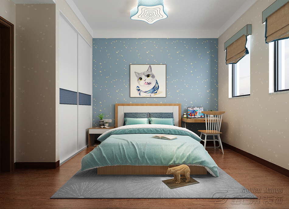 兒童房,主題明確,整個屋子布滿星星,淺藍色電視背景墻,奪人眼球,可愛的貓咪陪伴孩子左右,幸??鞓菲鋵嵑芎唵?,夢想并也不遙遠,這里是最好的答案。