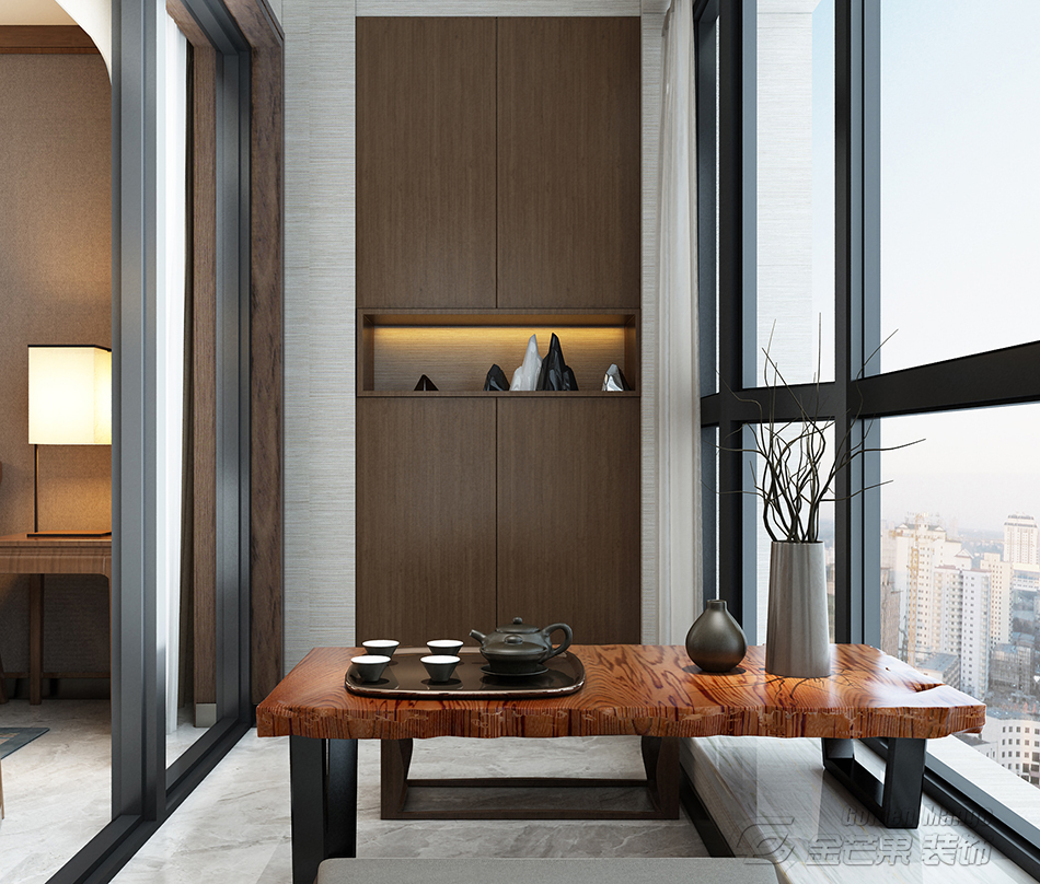 品茶區布置于陽臺,紋理豐富的木質茶桌。品味茶,味賞窗外景。陽臺布置的柜子方便儲物,也方便家居生活的使用。待客會友,品味人生,在這里都可以都可以有最好的滿足。