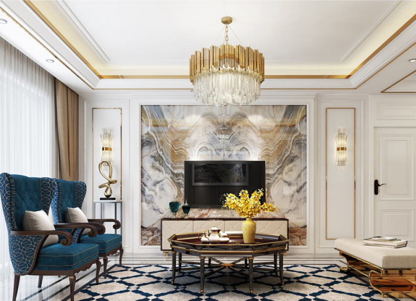 金色被大量使用,座椅、茶幾、吊頂、背景墻、燈光都使用金色元素,亮色金屬線條穿插搭配,提升整體的奢華品質。深藍色的椅子,在色彩上面更顯得活躍,和整體單一的色調形成鮮明對比。