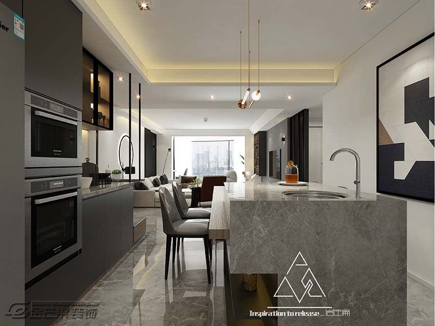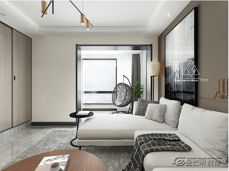 以黑白灰為主色調,灰色的地板搭配棕色的、有質感的墻紙和柜體,低調、干練、大氣,看似簡單卻充滿生活品味?;野椎纳嘲l讓整體色調不會過于暗沉,簡潔的地毯和茶幾既舒適又提升空間氣質,個性的燈飾使整體空間更精致了。墻上的寫意裝飾畫營造藝術感。