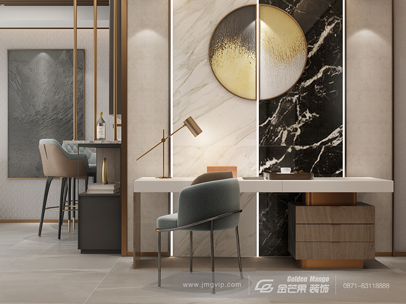 大量金屬色、金屬線條的運用,打造奢華的高級感。淺色為主,棕色為輔的色調,浪漫又優雅,高級又氣質,不免讓人聯想起港式電影里光線昏黃的鏡頭,光影閃爍間,韻味盡顯。