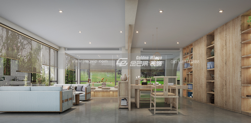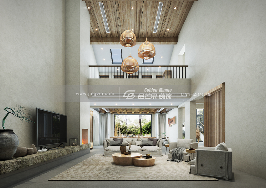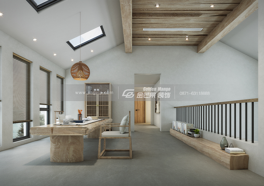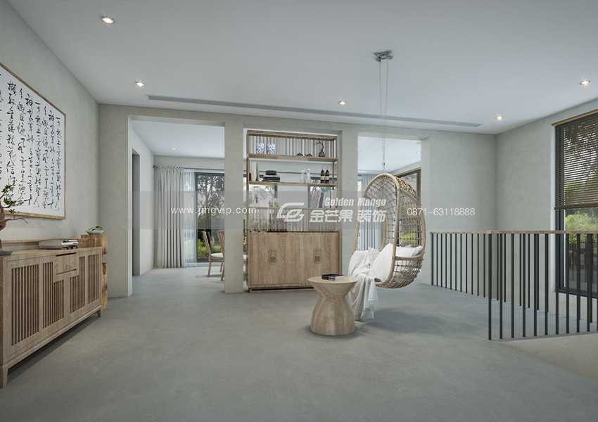 簡單的配色搭配原木的吊頂和家具,整個空間營造一種純粹、大氣、古樸的感覺。慵懶的沙發既舒適又時尚,簡單的茶幾回歸自然,吊燈既充滿設計感又為空間增添了溫馨、精致的感覺。客廳整體空間營造一種空靈、通透的感覺,讓身心得以釋放,有讓人置身叢林之感。