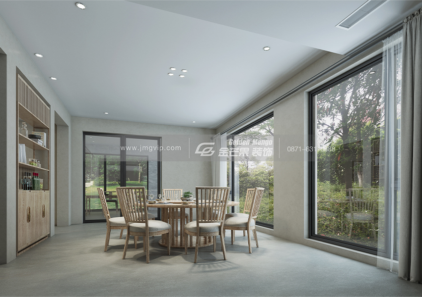 寬大的玻璃窗讓整個餐廳更精致了,搭配原木的餐座椅和櫥柜,既符合房間整體的格調,又具有自然、精致之美。