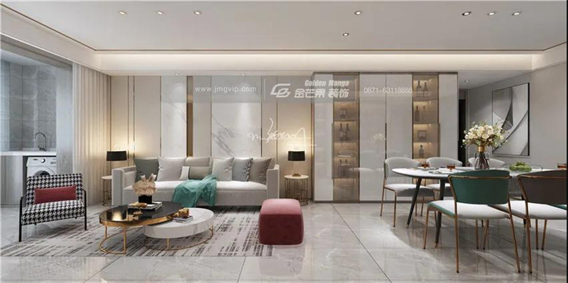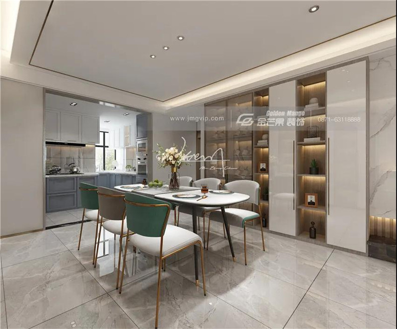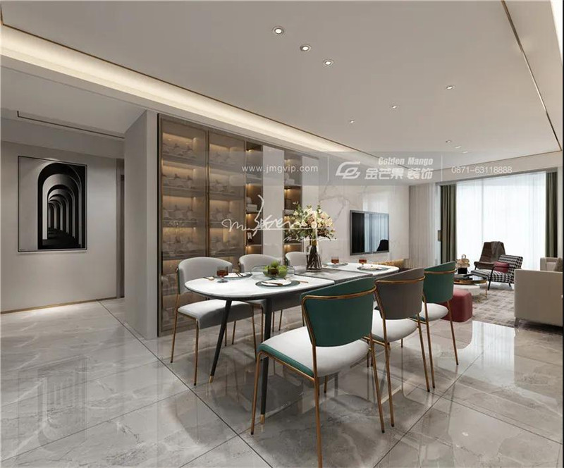 金屬元素的運用,輕松打造高級時尚感,精致而充滿氣質(zhì),旁邊的紅酒柜和餐桌椅搭配得相得益彰,讓生活充滿儀式感。