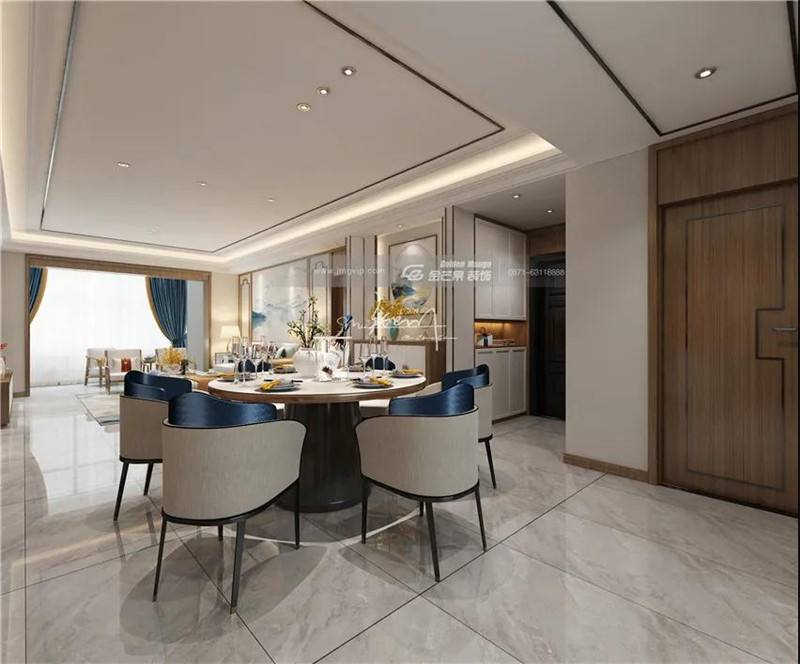 藍色絲絨質(zhì)地餐桌椅和中式家具的結(jié)合,展現(xiàn)一種奢華又雅致的家居,讓用餐也變成一件精致的事情。