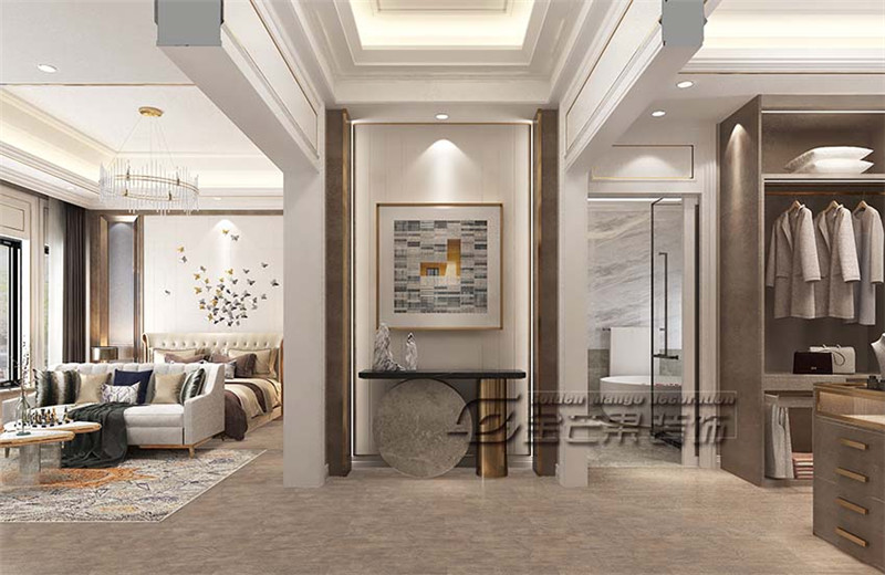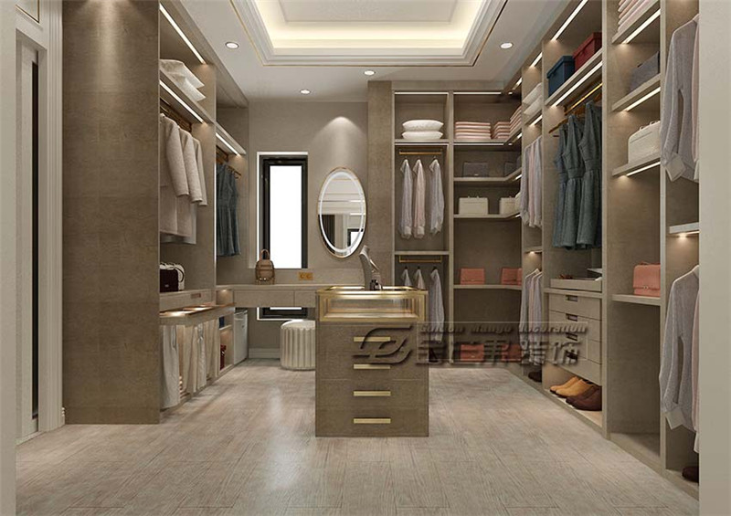 過(guò)道連接衣帽間和休息區(qū),一家人準(zhǔn)備出行,丈夫穿戴完畢悠閑的坐在沙發(fā)上喝茶看書(shū),等待精心打扮的妻子,不時(shí)幫妻子提點(diǎn)建議,一個(gè)浪漫的畫(huà)面。