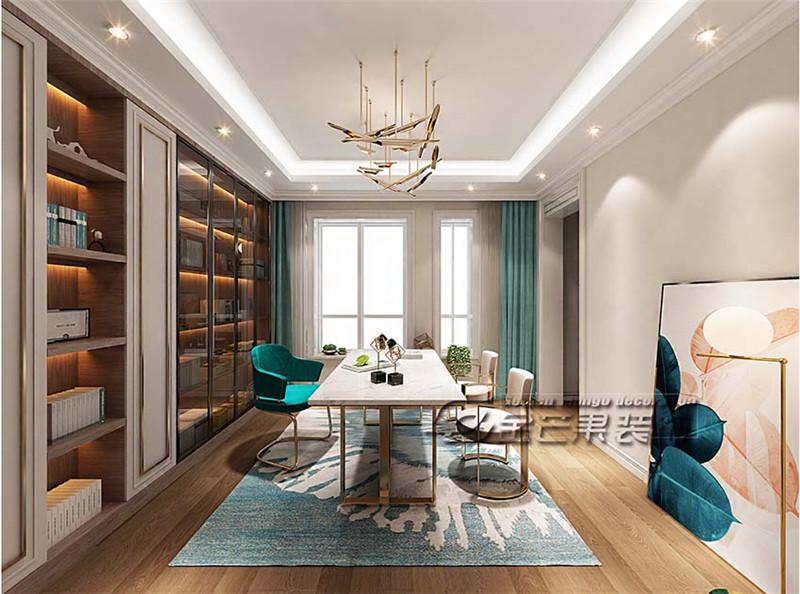 非常具有歐洲特色的書(shū)房,玻璃的柜體增加房間的時(shí)尚奢華感,顯得房間比較通透。書(shū)房同樣選用金屬質(zhì)地的桌椅。色彩選用的比較鮮明和張揚(yáng)的棕色、藍(lán)色,和古色古色的中式書(shū)房是截然相反的。