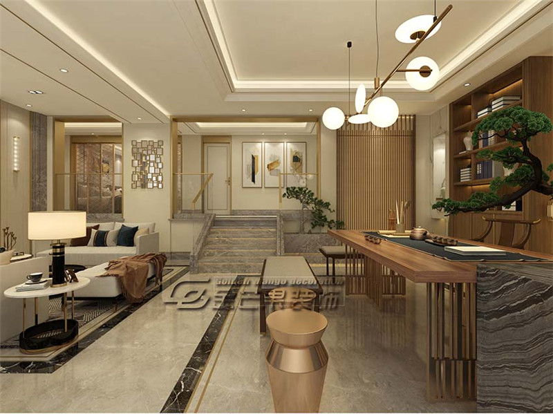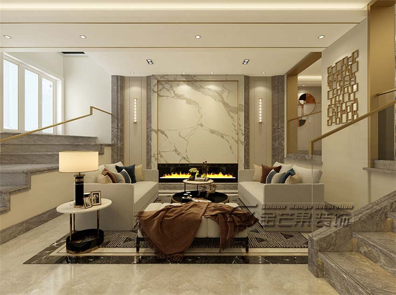 電視墻采用了大理石結(jié)合金屬線條的做法,輝煌大氣的造型,把整個(gè)客廳的基調(diào)定在了一個(gè)“貴”字上,典雅貴氣。