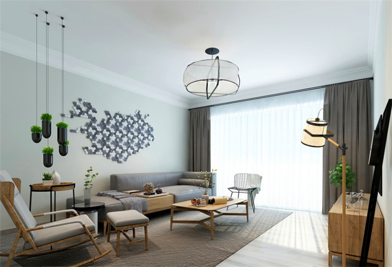 簡單的裝飾搭配清新的綠植,營造自然、休閑的氛圍?;疑拇昂?、沙發椅和地毯,輕松打造高級感,搭配個性的綠植裝飾,讓空間變得文藝且舒適。原木家具的選用讓空間更加接近自然和放松。