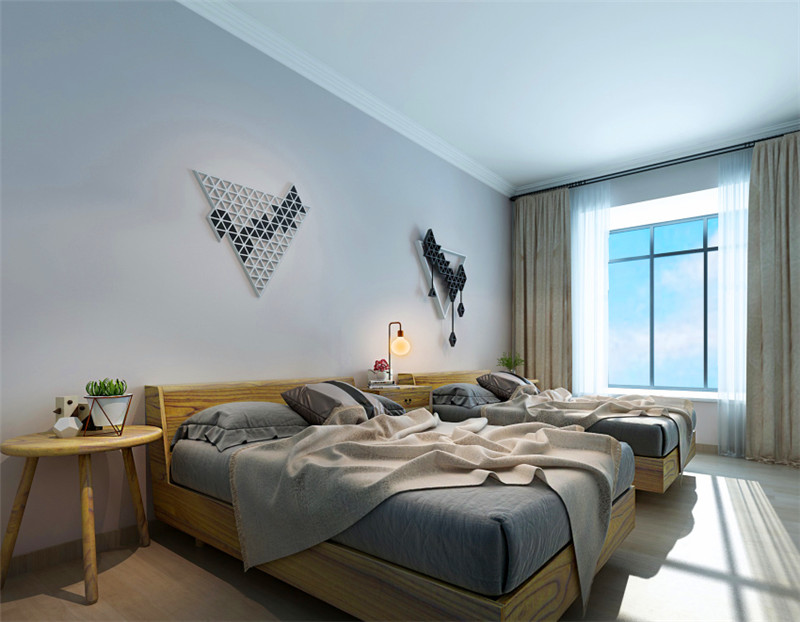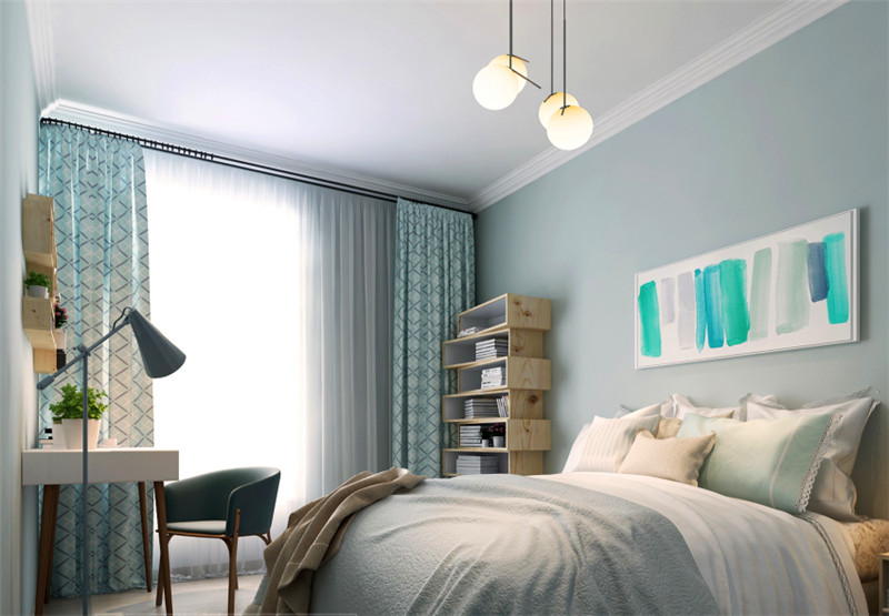 淺淺的藍綠色系,墻上的裝飾畫深化了整體顏色,點亮空間。帶有個性花紋的窗簾營造文藝氣氛,讓整體空間不會過于單調。個性的吊燈增加時尚感,原木的書櫥豐富層次。