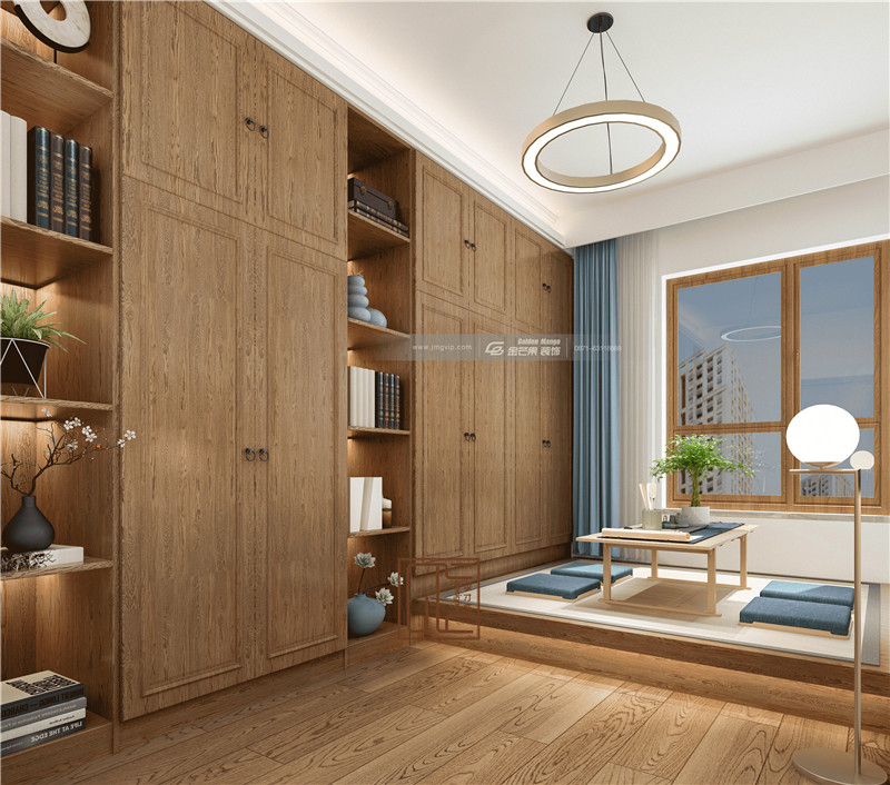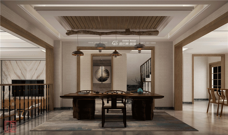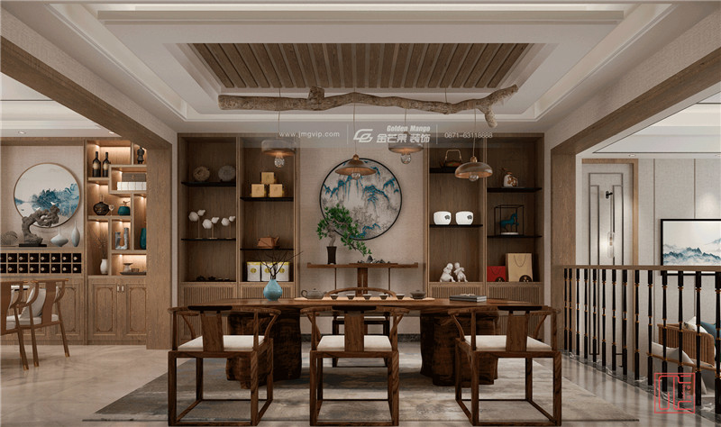 繼續(xù)沿用大量的原木家具,架上藏納古物雅玩,木材保留原始紋理的質(zhì)感,營(yíng)造充滿書香氣的雅致空間。
