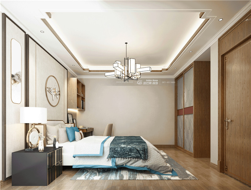 中式家具線條運(yùn)用鑲金渡邊的設(shè)計(jì),將中式傳統(tǒng)之美與現(xiàn)代經(jīng)典時(shí)尚之美相結(jié)合,貴氣優(yōu)雅。床頭設(shè)置吊柜,豐富空間層次,兼具實(shí)用性。