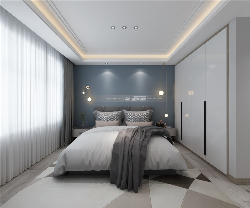藍色安逸又充滿魅力,燈飾的搭配就像藍色的星空閃爍的繁星點點,又像平靜的湖面上忽然泛起的波光。白色的紗簾純凈溫柔,給予心靈和肌膚親切的撫慰。
