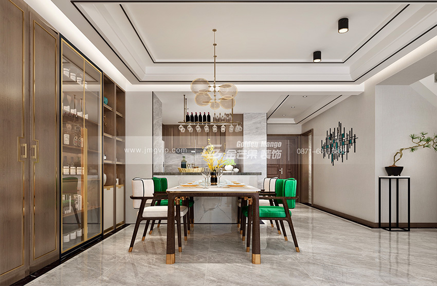 櫥柜中式花紋鑲邊,搭配玻璃的柜門,復(fù)古精致。綠色的餐桌椅在這里又體現(xiàn)出一種別樣的摩登感。