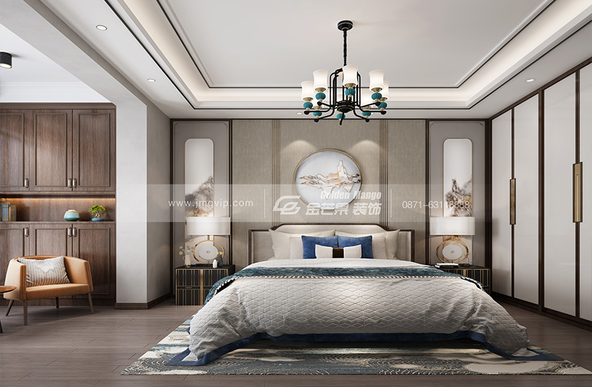 床頭背景墻的裝飾頗具中國傳統(tǒng)的溫潤如玉的美感,對稱的設(shè)置展現(xiàn)對稱之美。中式的吊燈和衣柜營造濃濃的中式氛圍。