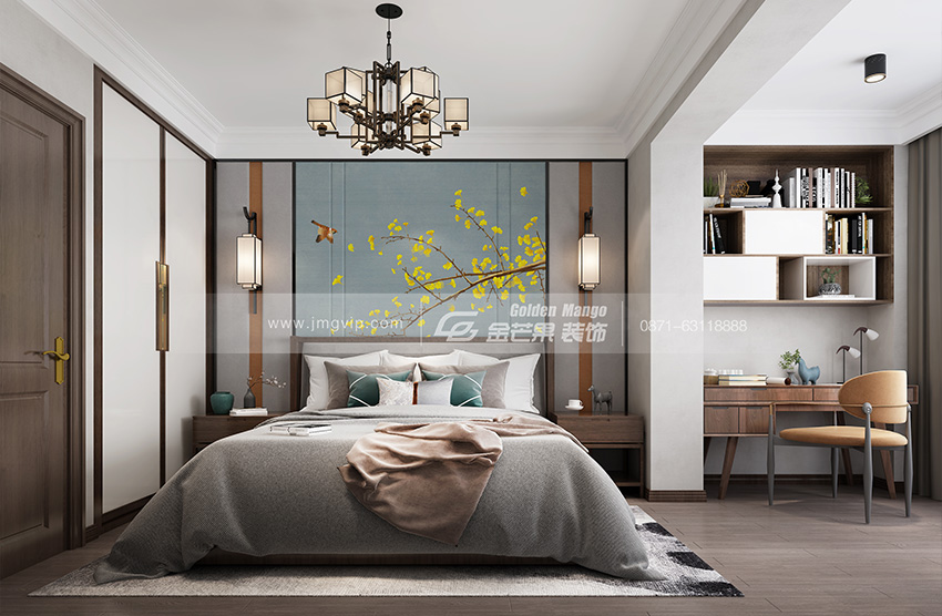 花鳥圖案和中式壁燈,輕松打造中國風(fēng),吊燈的選用亦是充滿中式的韻味。臥室同時兼具辦公區(qū)域,實用舒適。