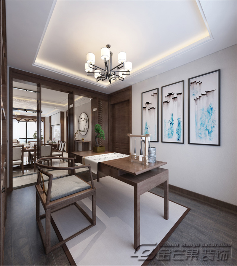 原木書柜和書桌椅在打造古色古香的氛圍,一些瓷器、筆架、迎客松等都非常具有中式特色。對稱的書櫥也呈現出一種對稱美,包括屏風的運用也是很有中式之美。