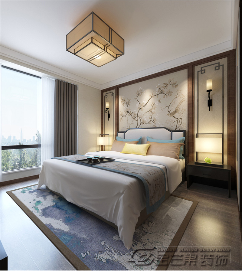 中式的床頭背景墻,豎直方正的線條打造傳統沉穩、端莊、大氣的感覺。中式的吊燈古色古香,提升空間氣質。