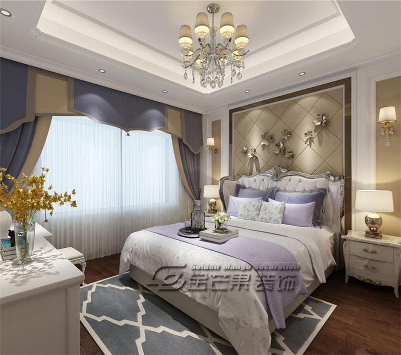 整體空間營造的是優雅、浪漫的感覺,歐式的床具搭配銀色的鑲邊,清新、精致又高貴。優雅的紫色和白色的窗簾相遇,溫柔、嫵媚。整體空間顏色搭配恰到好處,就像一杯加了奶糖的咖啡,香醇、甜美。