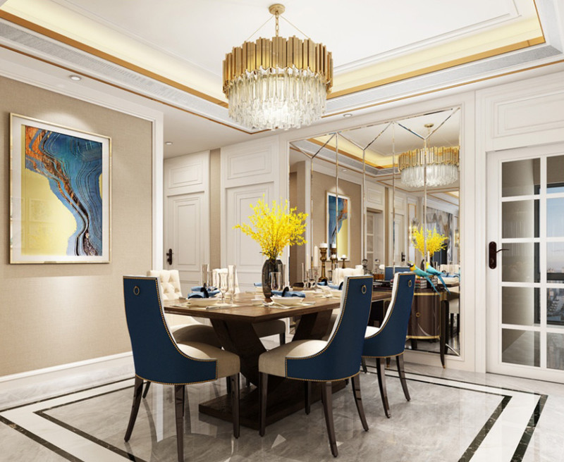 座椅的顏色和客廳的座椅相呼應,歐式的家具和奢華的吊燈,尊貴、大氣。