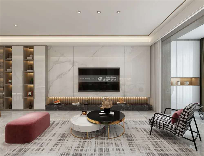 電視背景墻一整面的石材簡潔、大氣,黑白的搭配加上輔助光源的加持,讓家居氛圍更顯溫馨;裝飾柜的設計使客廳與墻面層次分明且兼顧收納和展示功能。