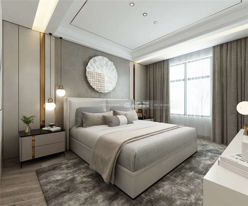 臥室作為每天生活中的加油站,最注重的是舒適。置身其中,你會發現區別于過去的奢華設計,整個空間既沒有過于繁復的造型,亦沒有豐富色彩的疊加,而是以一種直撩心底的優雅魔力,給人帶來輕松舒適、溫馨大氣的感覺。純凈、簡潔的空間,溫潤的背景墻和地板營造舒適的氛圍;床頭背景墻的掛飾讓整體空間更加文藝、有趣、有氣質,不顯單調,在細節之處彰顯高級感。