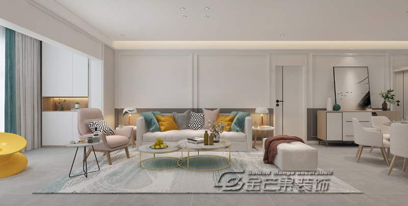 沙發背景墻以暖白色為主,凸起的方形石膏線條走邊讓普通墻體瞬間高級起來;暖白色沙發上井然有序的擺放著莫蘭迪綠,橙黃,皮粉等色彩明艷的抱枕作為點綴。吊頂邊緣嵌入式暗燈帶的設計使得客廳明亮通透,光線柔和不刺眼。
