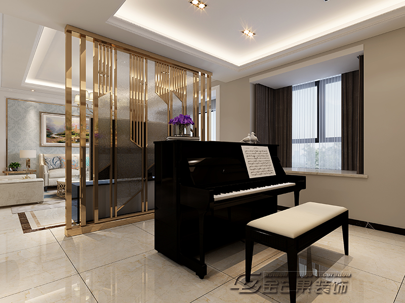 整體空間以象牙白為主色調,搭配藍、白色調的家居和窗簾,雅致清新。鐵藝家具的運用在歐式風格的打造中非常常見,鍍金鑲邊的家具增加奢華、浪漫的氛圍。異域風情花紋抱枕和個性化設計的茶幾令整個空間更優雅,提升檔次。