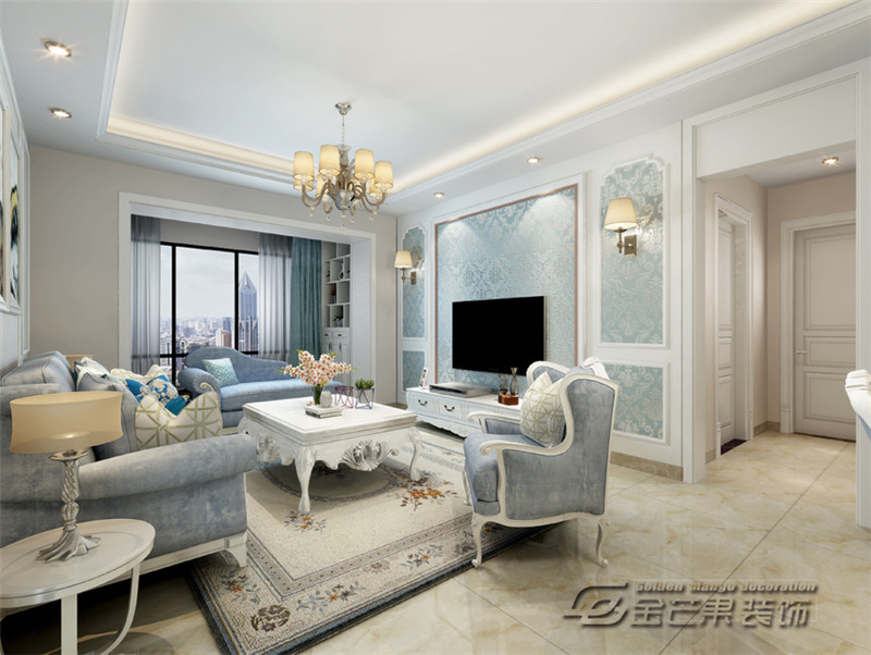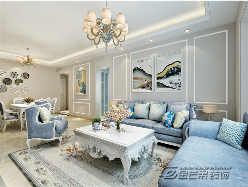 整體空間是以藍白色調為主,打造清新、優雅的北歐風。歐式的家具搭配藍色的壁紙,優雅又有格調。白色和藍色碰撞出不一樣的火花,歐式的華貴優雅和藍色的沉靜大氣互相綜合,打造有格調又氣質舒適美家。