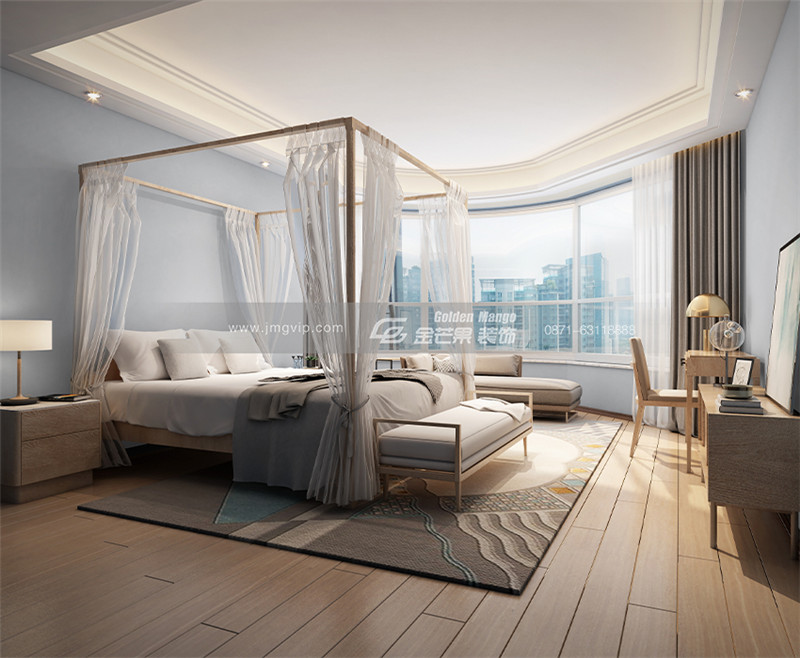 寬大的玻璃窗讓房間變得通透、明亮,曲線的設(shè)計(jì)讓房間更具有設(shè)計(jì)感和溫馨感,木質(zhì)的地板端莊大氣又優(yōu)雅。