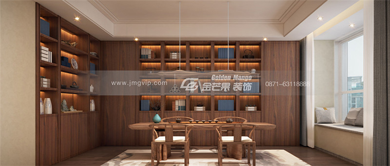 古色古色的書(shū)房,雅致、大氣有韻味。原木的柜體充滿(mǎn)典雅、書(shū)香的氣息,加上輔助光源的加持,整個(gè)空間呈現(xiàn)出雅致、有文化氣息的格調(diào)。