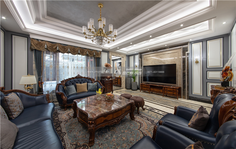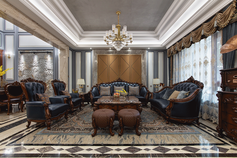 雕花燈槽彰顯低調(diào)的華麗,增添幾分奢華的味道。墨藍(lán)色沙發(fā)格調(diào)盡顯,運(yùn)用貫穿其中的皮革元素,搭配古樸、復(fù)古的造型,營造宮廷皇室般的感覺。西方復(fù)古元素的地毯,更顯貴氣。