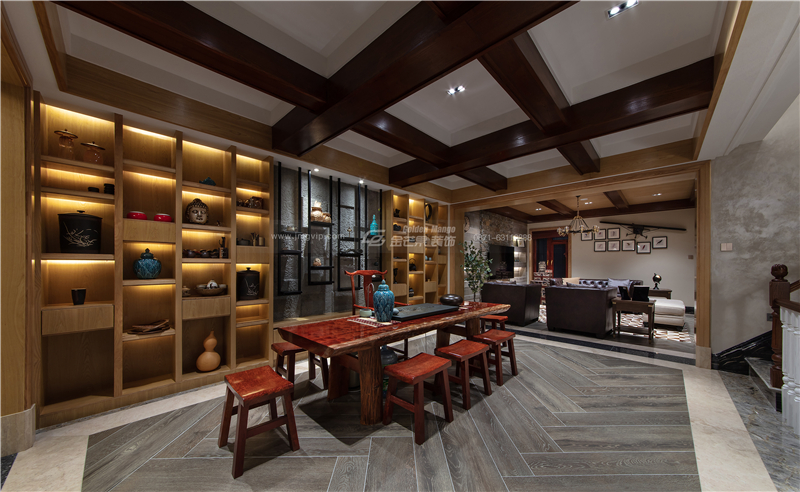 典雅大氣的中式茶室,運(yùn)用面積優(yōu)勢設(shè)計(jì)一整面墻的展示架,帶給人視覺上的沖擊力,一茶一室,皆是生活。