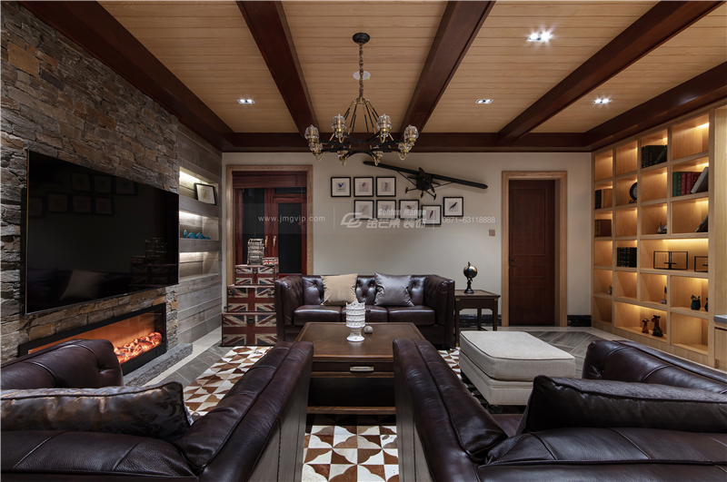 休閑客廳是比較隨性的格調(diào),但與之于整個(gè)空間是協(xié)調(diào)的。柔軟的皮革,簡潔的家具,仿原始建材的背景墻,壁櫥,營造一種慵懶的氛圍,滿足業(yè)主平時(shí)一些放松、休閑的需求。