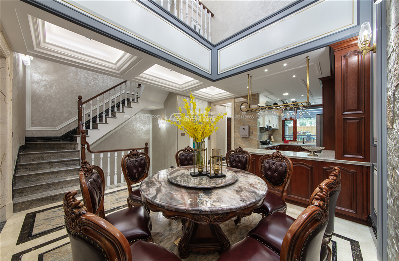 餐廳挑高的區(qū)域,也是大宅的設(shè)計(jì)特性之一,讓整體看起來更加恢弘、華麗和尊貴。大理石臺面的餐桌搭配棕色皮革餐椅,一剛一柔之間展現(xiàn)復(fù)古的高級感。