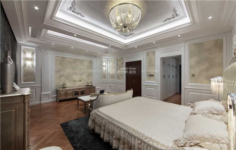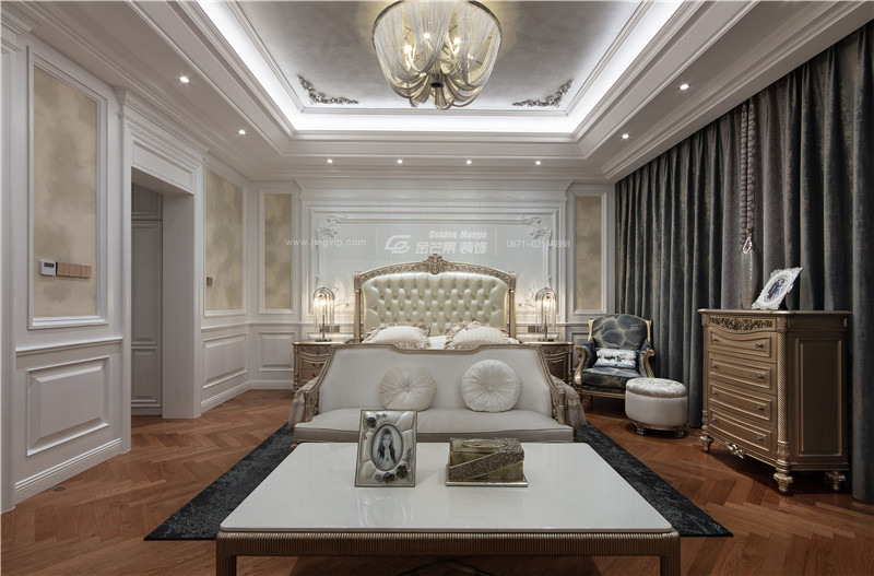 寬闊的空間加上大面積的白色,浪漫、高潔的臥室歲月構(gòu)想在此流動(dòng)成一段唯美的樂章。如夢似幻,燈飾的流蘇設(shè)計(jì)仙氣飄飄,無論是吊頂?shù)你y色雕花還是墻上的雕花暗紋,無一不透露出細(xì)節(jié)的搭配。