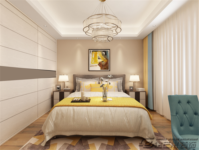 臥室是以溫暖的暖色系為主,非常溫馨,暖意融融,輕松舒適。有設(shè)計感的吊燈增加時尚感。白色窗簾溫柔又時尚,搭配黃、藍(lán)色,顏色明快、靈動、活潑。