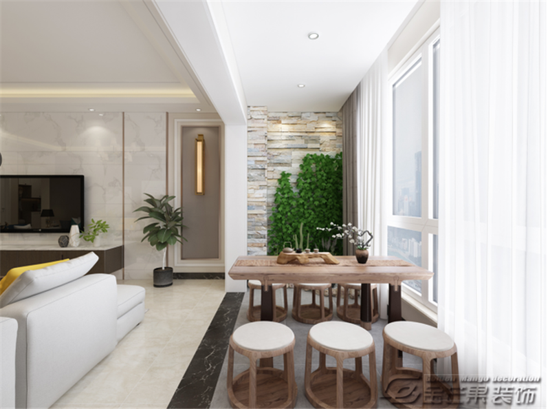 陽臺設(shè)置了木質(zhì)的小茶幾和椅子,搭配綠植,充滿大自然的味道。忙碌之后,到此喝一壺茶,看一下遠(yuǎn)處的風(fēng)景,不失為一樁美事。