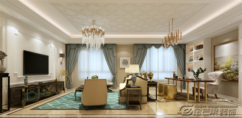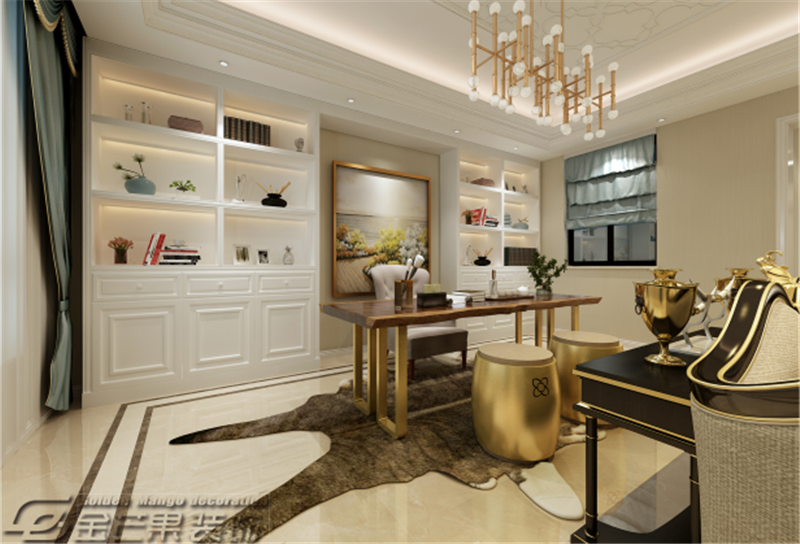整體空間是以白色為主色調(diào),搭配棕色、米色、金色等輔助顏色,通過色彩的對(duì)比給人打造出一種華麗的感覺。充滿歐式特色的窗簾、沙發(fā)、桌椅、裝飾畫打造歐式風(fēng)格。金色家具的應(yīng)用給人奢華之感但又不顯夸張,恰到好處。客廳和書房的搭配增加房間的功能性。