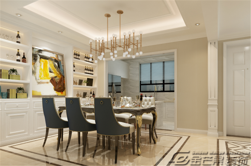 餐廳的桌椅選用上繼續(xù)沿用歐式風(fēng)格,藍(lán)色的座椅和整體空間的其他顏色點(diǎn)綴相呼應(yīng),紅酒柜上的紅酒、墻上的掛畫,營(yíng)造歐式氛圍。