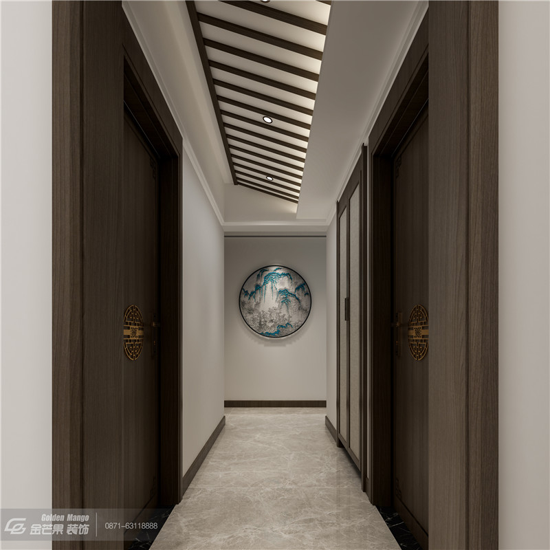長步廊,寬窄巷,獨特的斜頂設計,兩邊的門點綴金色的中式圖案,將傳統的中式景觀鐫刻進家里,自成一景。