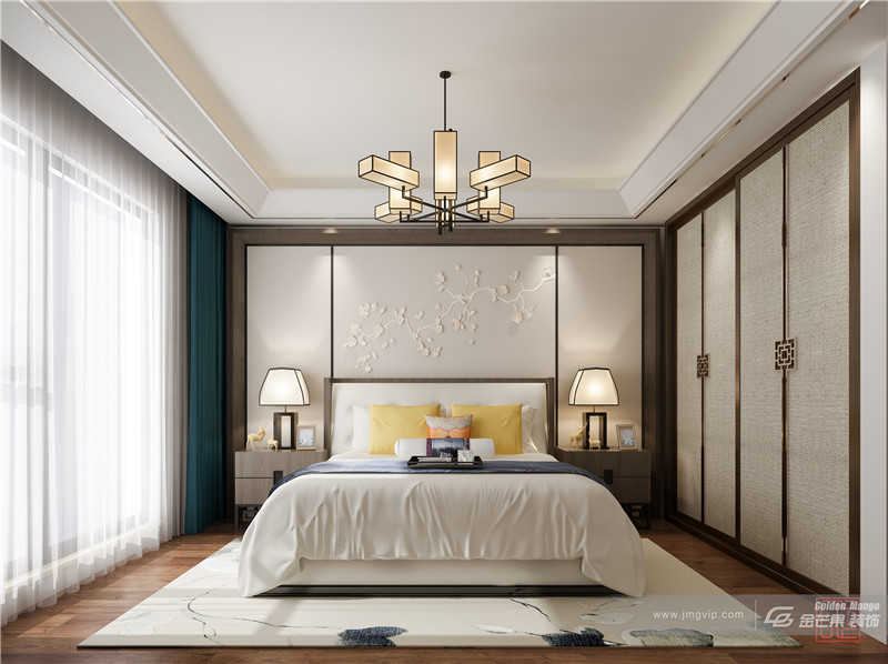 清麗、婉約的配色,展現的另一種端莊秀麗的中式之美。床頭背景墻含而不露的暗花設計,清麗脫俗,別有一番高潔的雅韻。