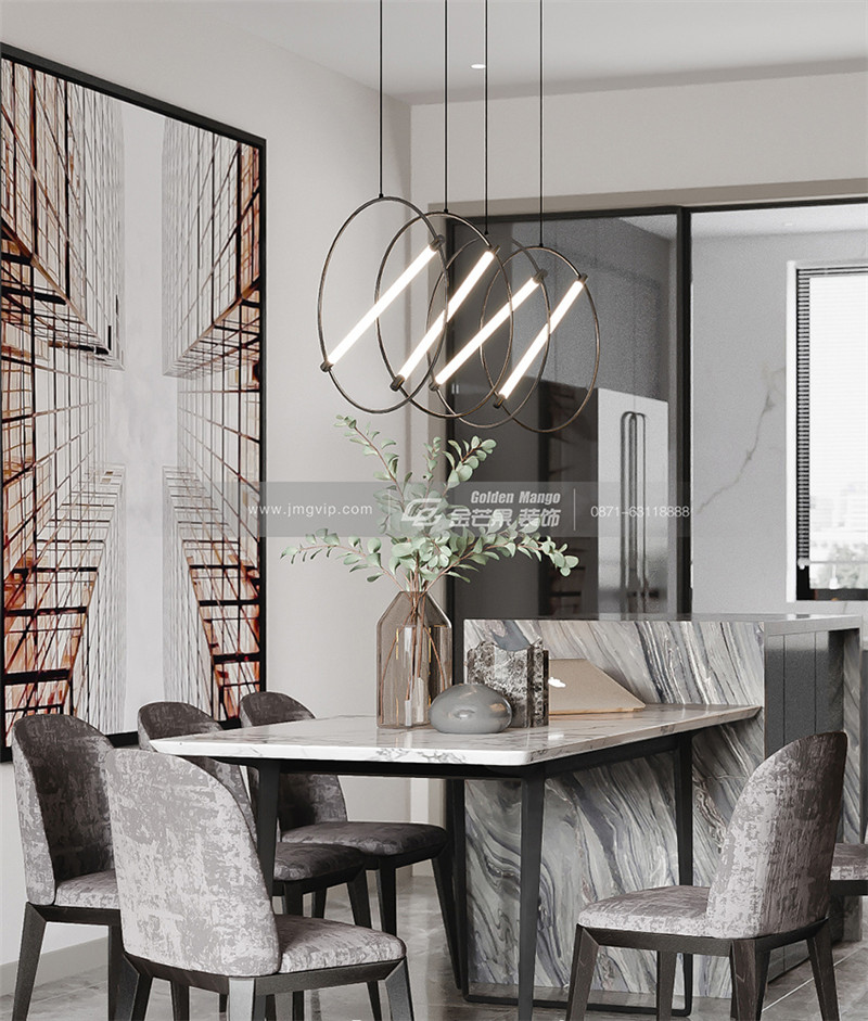 灰色的簡約和純粹的綠色搭配,營造出一種清新、清冽的氛圍。個性的燈飾為整個空間增色不少,讓餐廳變得更加精致了,也更有藝術感了。