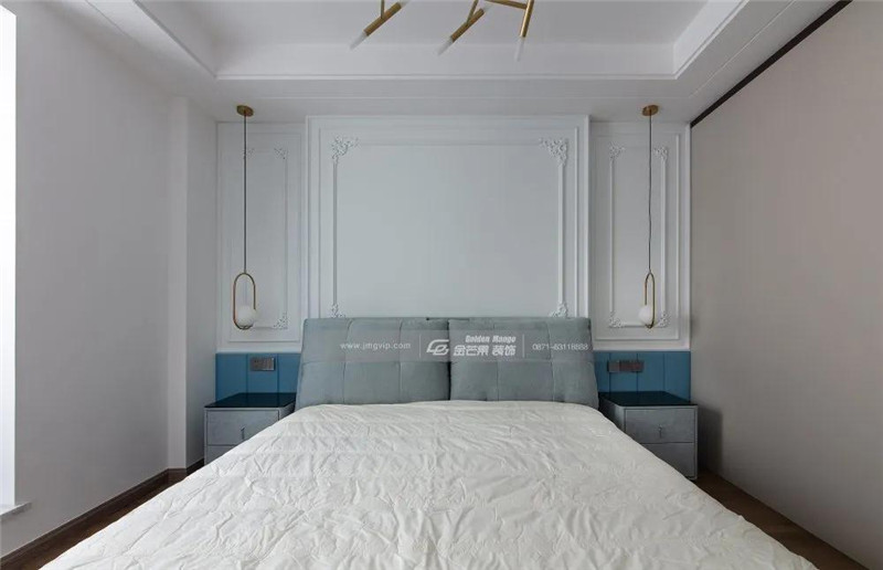 主臥背景墻利用法式線條和硬包做處理,墻面的雕花設計為空間注入浪漫的氣息,生活固然平淡,但儀式感也很重要哦。