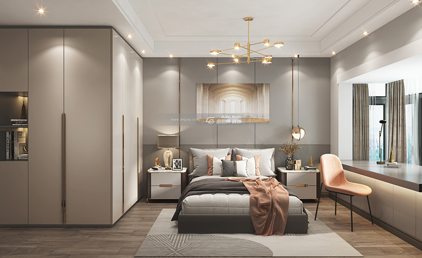 香檳色的色調展現溫柔、高級的格調,精美的燈飾更添精致感。符合臥室柔美、溫馨氣質的空間氛圍,高級感充斥在每個角落。