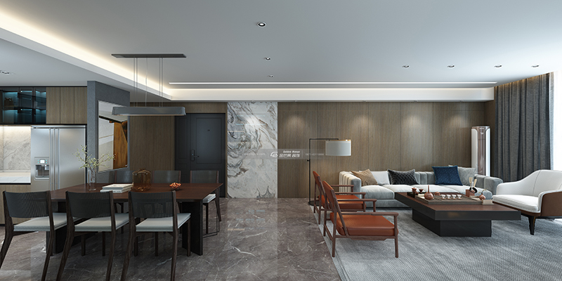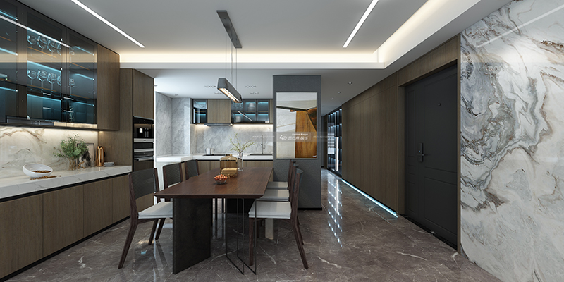 簡潔的線條突出物體本身的品質感,簡約、和諧的顏色搭配優雅又舒適。大理石材、玻璃、木飾面的運用,讓整個空間層次感豐富,不會單調。